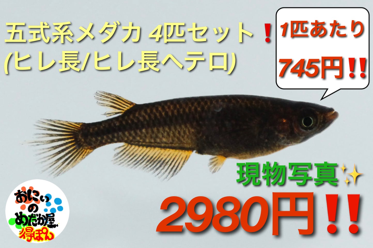 得ぽん‼️五式系メダカ ヒレ長 / ヒレ長ヘテロ (GODヒレ長YG) 4匹セット‼️(3匹+おまけ1匹) 1匹あたり745円‼️
